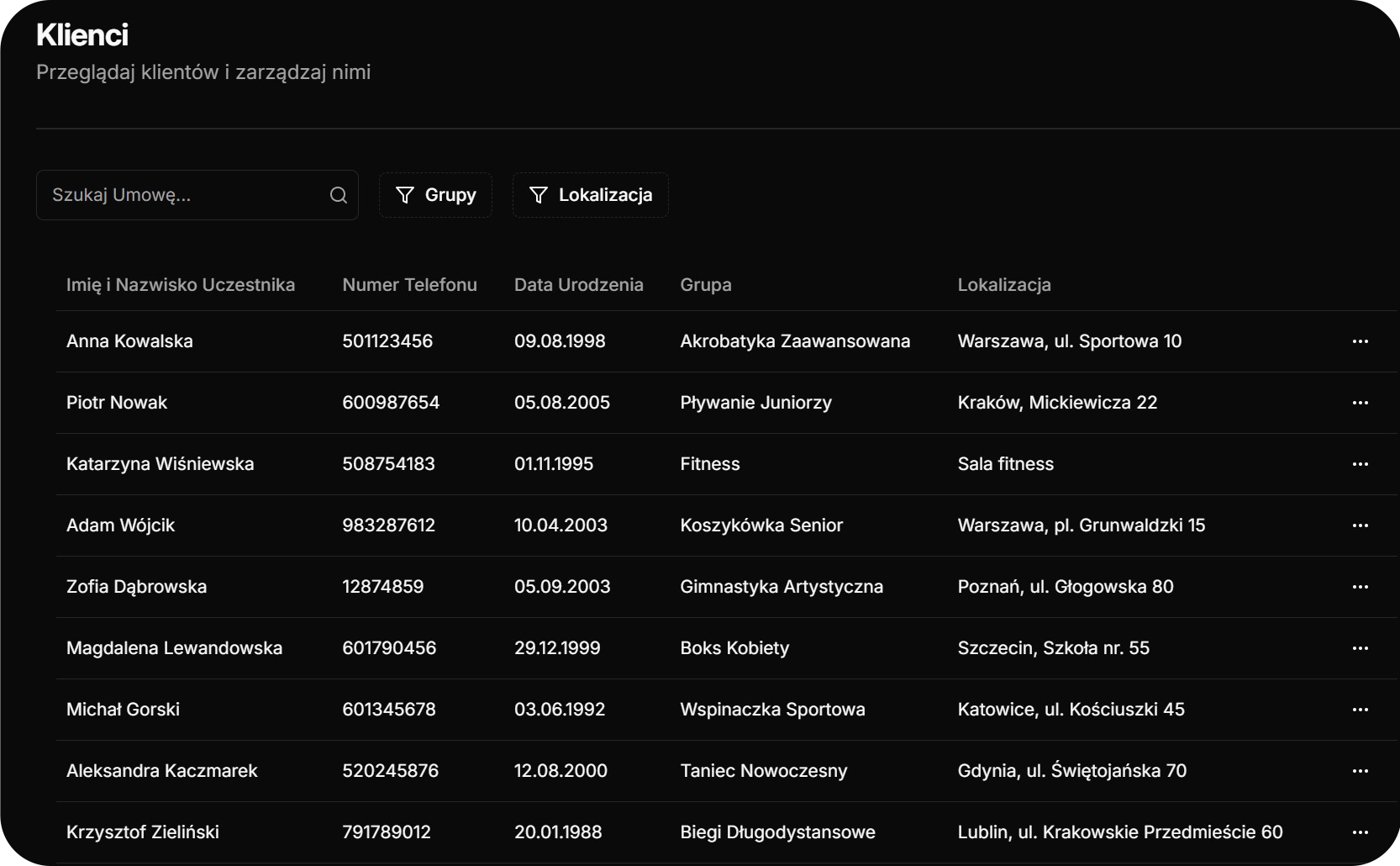 Każdy klient jest na swoim miejscu. Z łatwością zarządzaj ich danymi, monitoruj status karnetów i śledź zapisy na wydarzenia. Pełna kontrola na wyciągnięcie ręki.